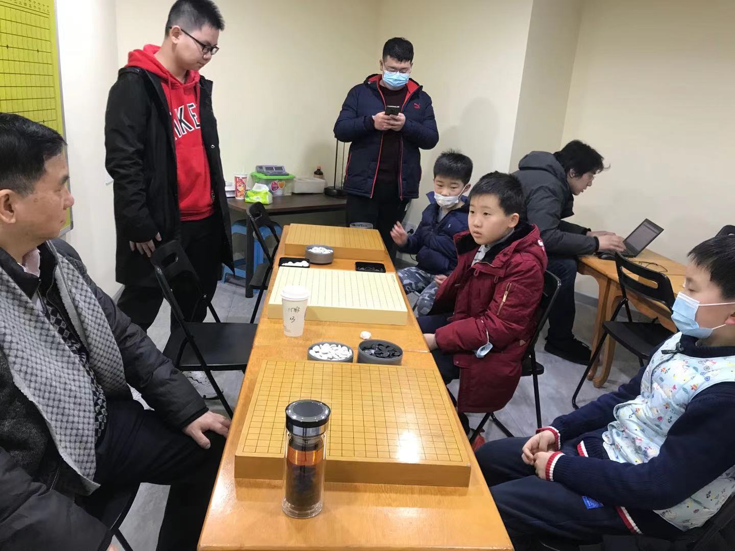 2021年2月5日,原杰盛学员、现职业棋手曾渊海来学校,看望在寒假班上课的李校长、伍老师,并与学校5段班优秀学员程一然、李屹辰、夏梓恒进行了一对三的指导棋。