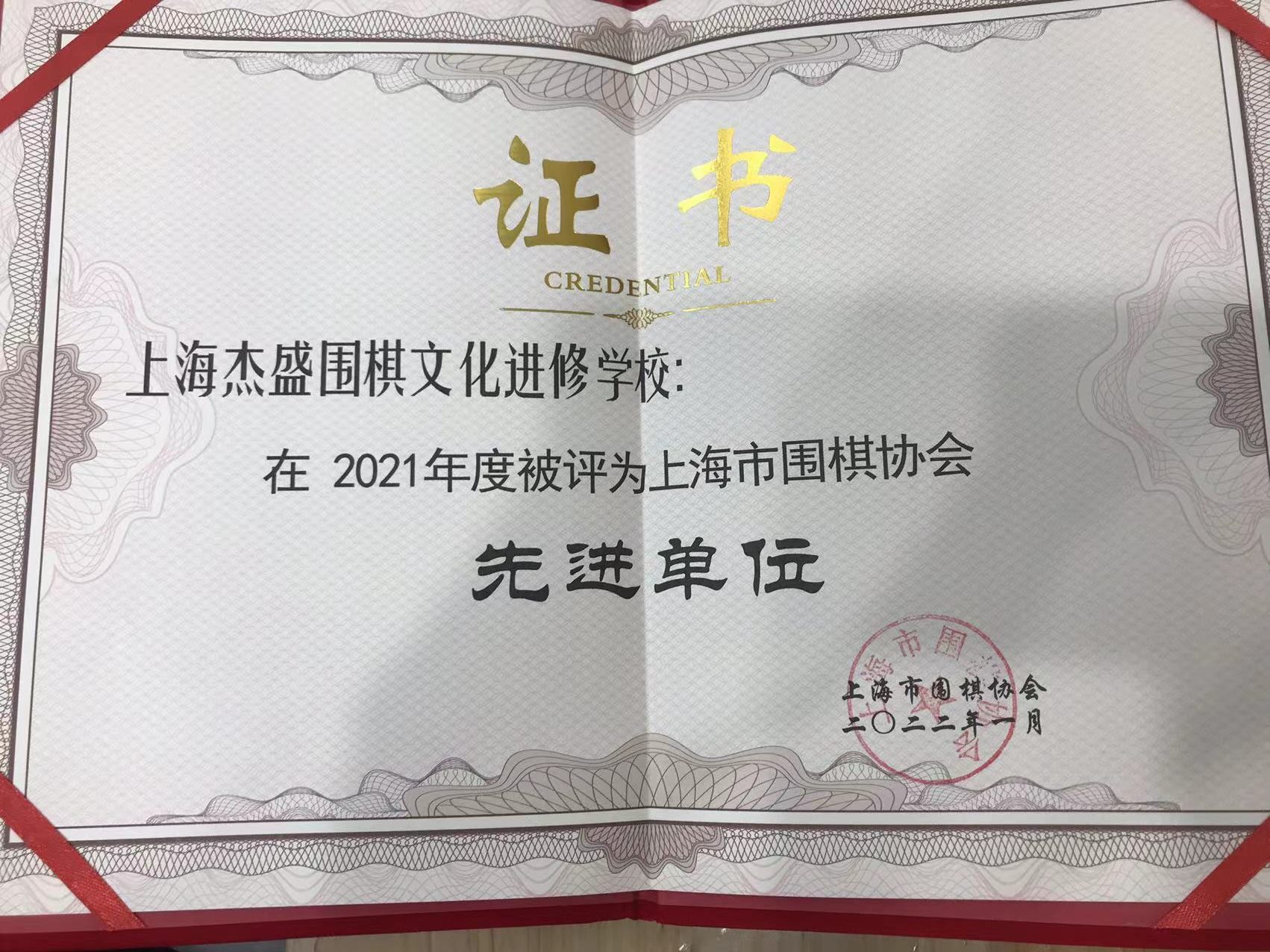 2021年,上海杰盛围棋文化进修学校,被上海市围棋协会评为“先进单位”,值得庆贺!!