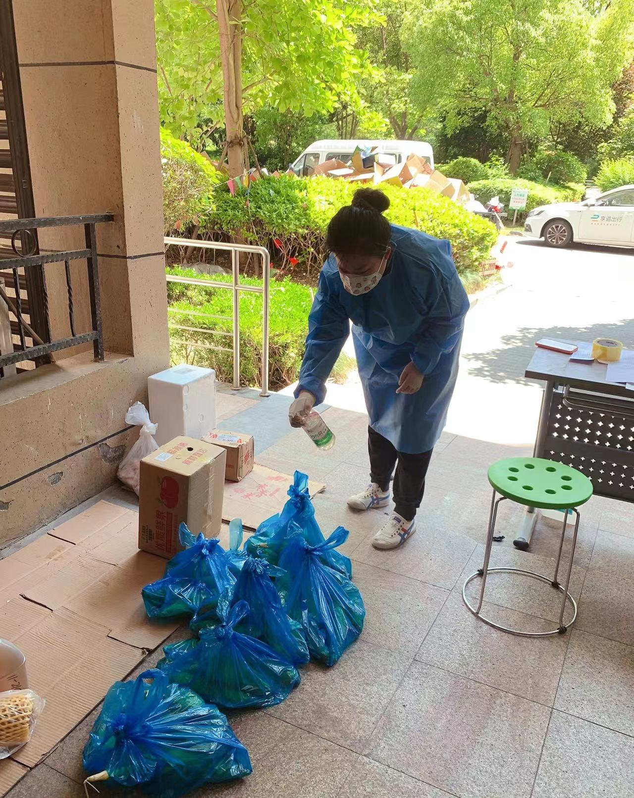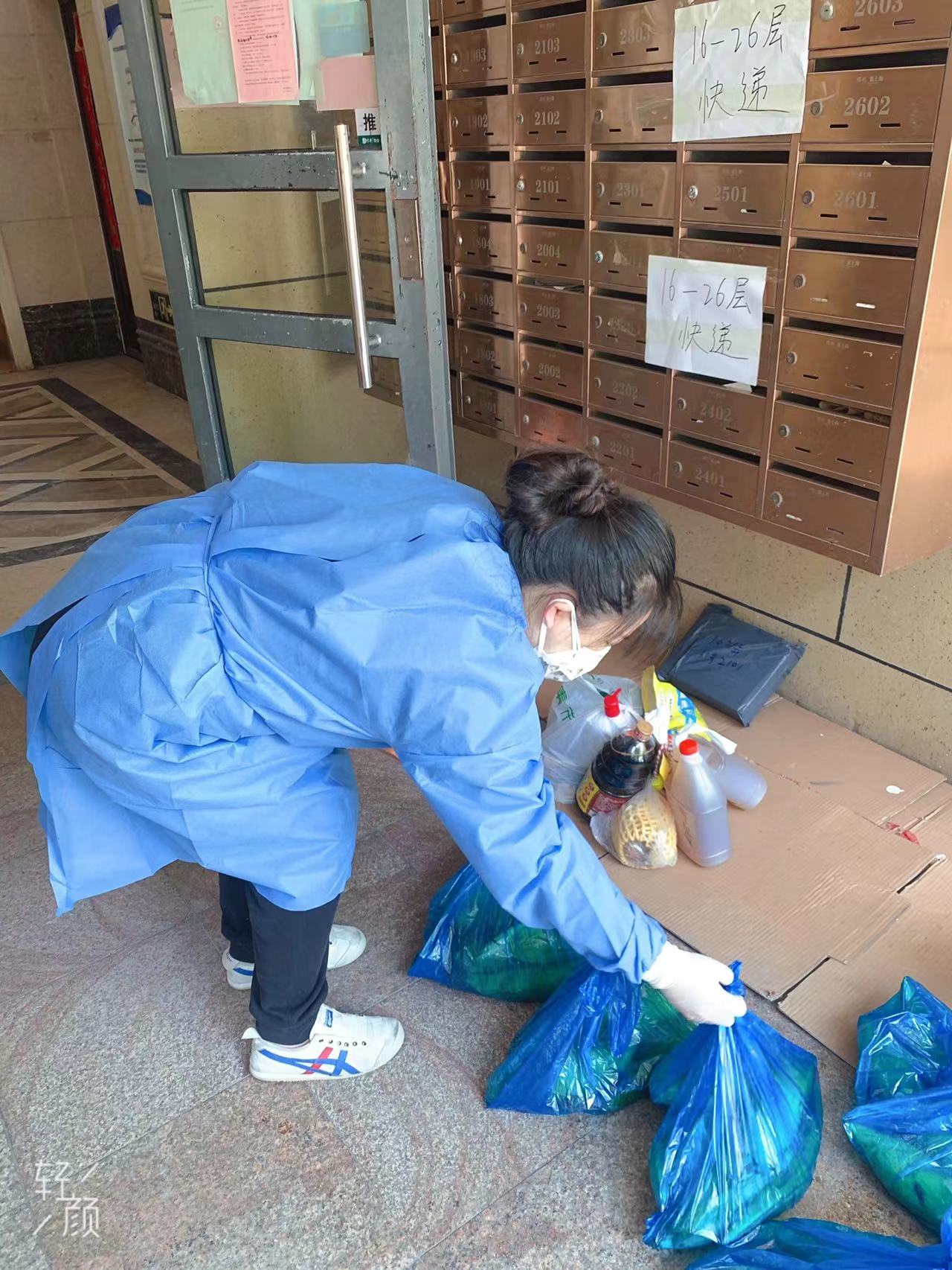 她们将生活物资派发到居民楼下,方便居民逐户下楼领取。