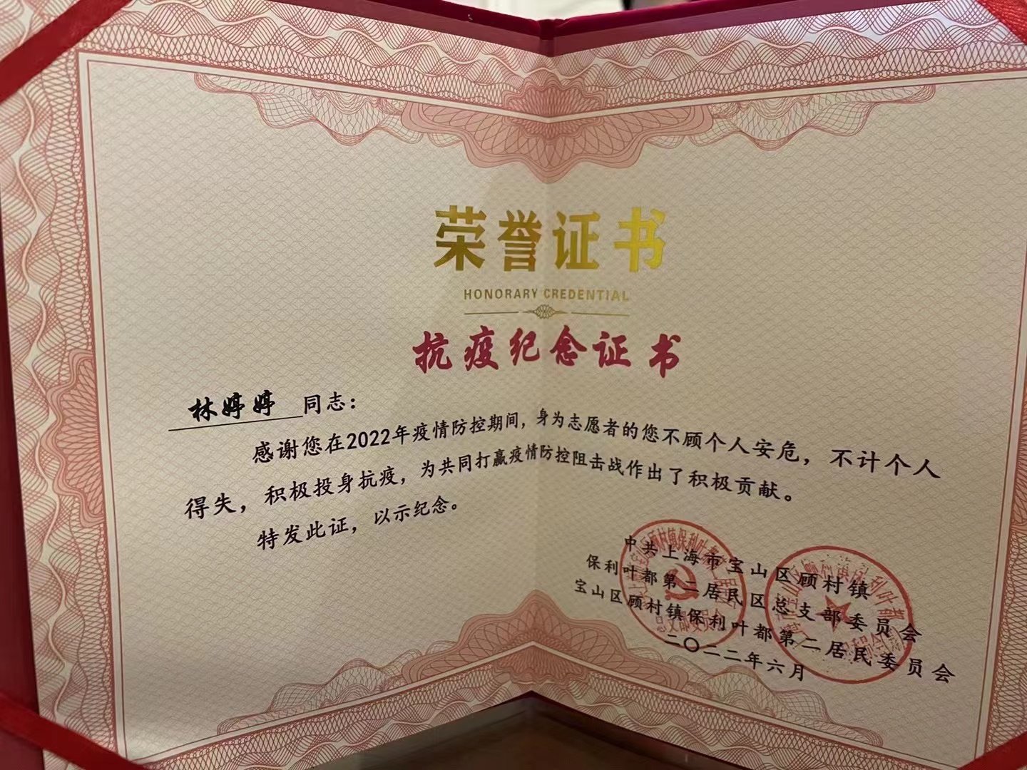 林婷婷老师的辛苦付出,不计个人安危,不计个人得失,积极抗疫的行动,得到了居民的称赞和上级领导的表扬,六月她拿到了属于她的“抗疫纪念证书”。
