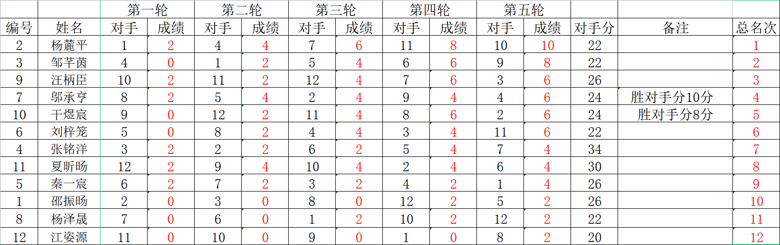 学校组织这次比赛,就是让学员找到自己努力的方向,也让老师找到培养的重点。比赛是紧张而有序的,学员们都把这次内部比赛看成是自己学习的一个成绩单,他们兴奋、积极、拼搏。通过二个半天,共四场的比赛,部分学员脱颖而出。请看成绩单: