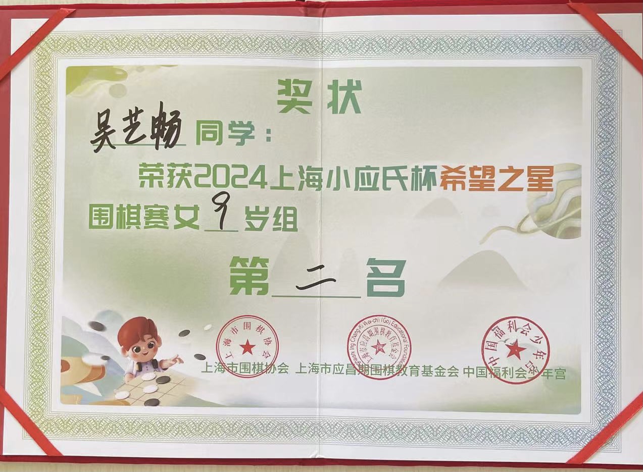 7月2日,2024年小应氏杯上海希望之星围棋赛在中国福利会少年宫举行,本届赛事共吸引了1500多名小棋手报名参赛,上海杰盛围棋文化进修学校段位班学员吴艺畅也参加了女子9岁组的比赛,并获得第二名好成绩。值得祝贺!